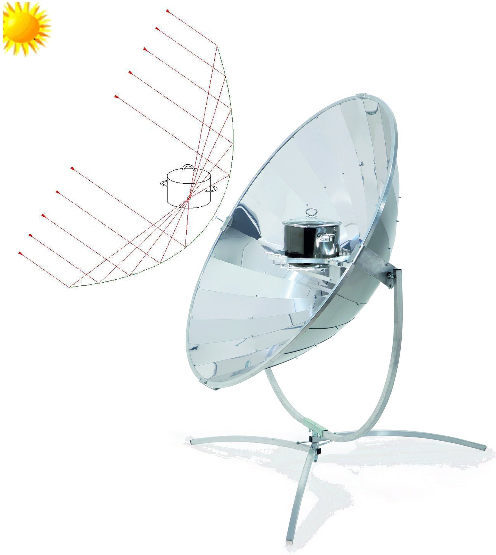 La superficie riflettente dello specchio parabolico è costituita da alluminio lucido resistente agli agenti atmosferici. Il nostro fornello solare è robusto e facile da usare. A causa del punto focale basso, deve solo seguire il corso apparente del sole ogni 25-30 minuti.